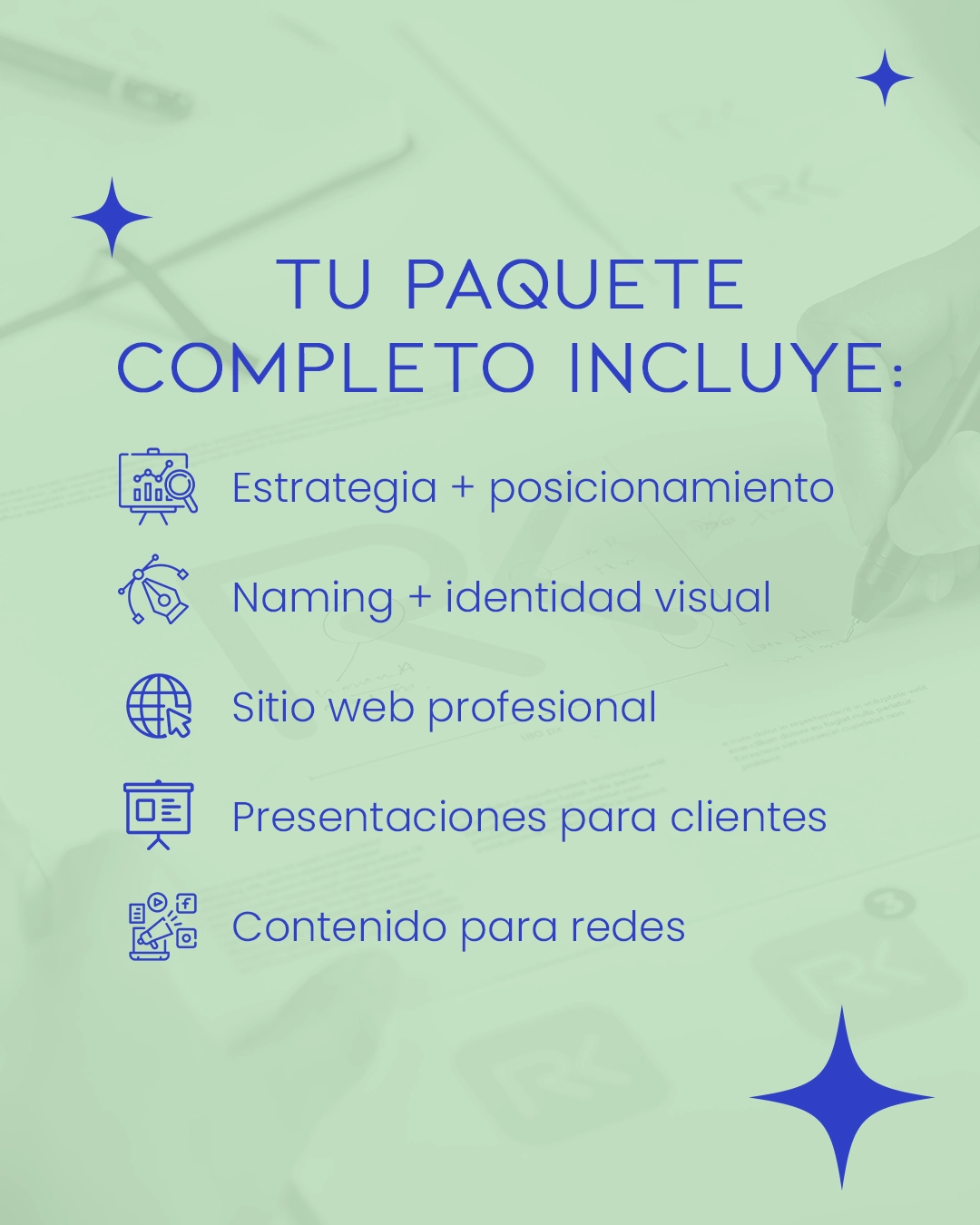 En seis semanas, cuentas con estrategia y posicionamiento, naming e identidad visual, sitio web profesional, presentaciones para clientes y contenido para redes. Todo desarrollado de forma coherente y alineada con tu visión.